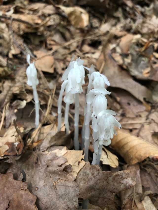 We took a break for water and snacks, then turned back the way we came and headed once more for the Cemetery Ridge Trail, noticing as we walked back the other way that there were Monotropa uniflora, Indian pipe plants, everywhere on the forest floor. These parasitic, mycoheterotrophic plants take in nutrients from mycorrhizal fungus and grow only in the perfect conditions. They were all over the Appalachian Trail, and though they are a bit creepy, it was nice to see them again, like someone you recognize from a different time.