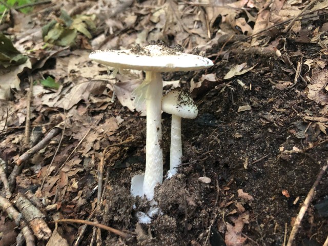 We miss the supposed view at Amburgy Rocks because our map and notes are not easy to parse, but we take a side trip to Limestone Knob, the highest point in Rowan County, for lunch. There’s not much of a view up there, but on the way up we see another beautiful mushroom: a perfect snow-white Amanita bisporigera, the Destroying Angel. It’s as perfect as a mushroom can get: delicate gills and fresh veil and volva (the egg structure at the base of some Amanita species), thin stem and blinding white cap. Most people who take a bite of this mushroom enter liver and kidney shutdown within 24 hours and do not recover. That so much destructive power sits within a four-inch-tall mushroom in the forests of Kentucky takes my breath away.
