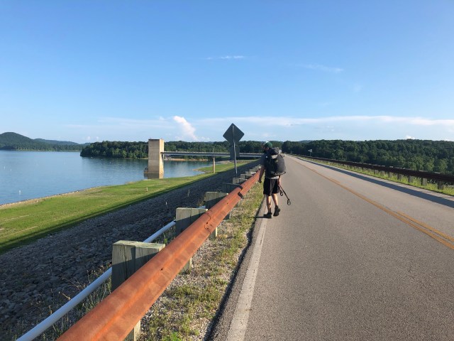I always find it harder to walk in the evening. We make it to the Ranger Station at Cave Run, but it’s closed, and there is no water spigot, which is disappointing because I’m almost out again. We follow the Trace around the lake and back out on the road. We walk across the dam, the sun blasting its last-effort rays on our faces, and I am suddenly so tired I don’t know how much more I can take.
