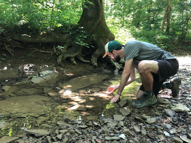 We’re going into Frenchburg for another resupply tomorrow. We wanted to get near mile 53 because the Trace Notes say there’s water there. But as we’re walking we see a campsite to our left that attracts our attention. It’s perfectly flat, surrounded by hemlocks, and right next to a creek that’s actually flowing with several inches of water.