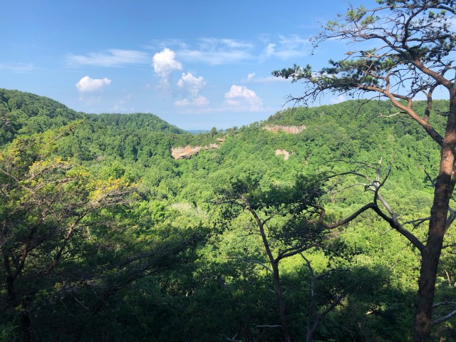 A couple of miles into our walk we come to the top of the hill and see a pine-dotted clearing to our right. We follow the short trail and then we see our first real view of the entire Trace so far: a sweeping sunny panorama out onto the leafy valley below, with a clear look at a sandstone arch spanning two hills in the distance. It smells fresh and coniferous, like Northern Arizona in the morning.