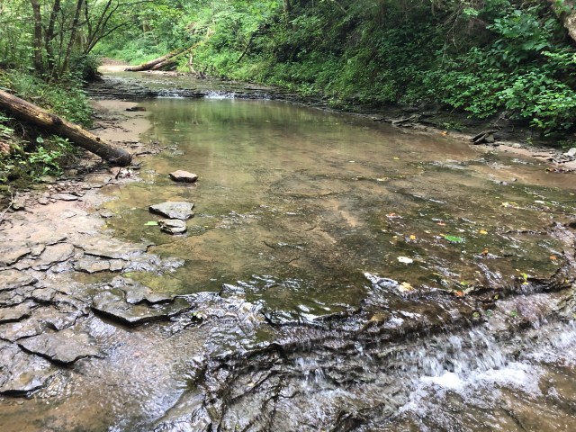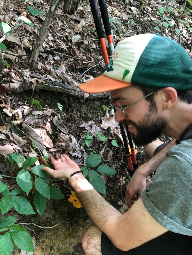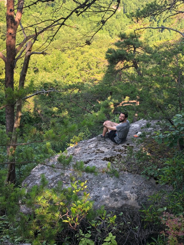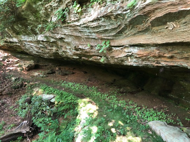 Since we got to camp at a decent time last night, waking up at 6:00 am isn’t hard for once. It’s already hot, but not as bad as it could be, and as we cross back over the creek and head up the road we start to feel like the trail is taking a beautiful turn. We’re rested and our conversation is much more animated than it was this time yesterday. We leave the forest road and turn back into the woods, and soon we are hiking upwards through rhododendrons and around dripping sandstone rock formations. It strikes me that we are not far now from the Red River Gorge.