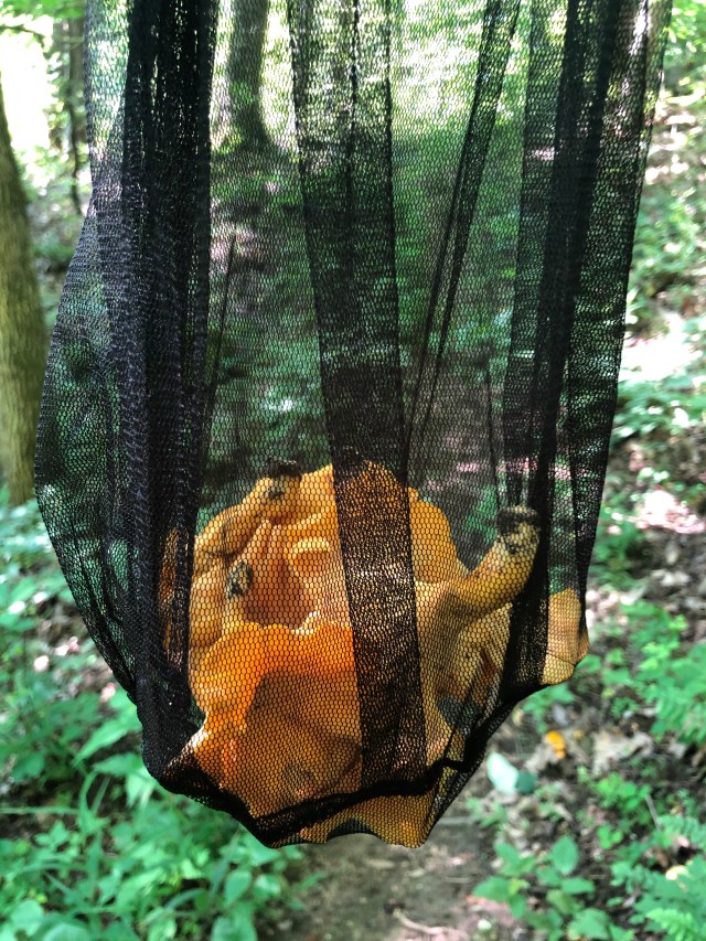We start picking, Wiggs sliding the stems into the mesh on my pack. We want more, but there isn’t enough space. So I begrudgingly take off my head net, my last line of defense against the evil biting flies, and use it as a mushroom collecting bag. Not much later, we come across another patch and can’t resist picking even more. The bag is getting heavy and it looks like we’ll be having nothing but chanterelles for dinner. Somehow, it doesn’t seem like a bad idea.
