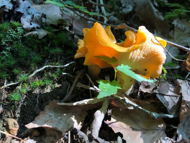 Something orange catches my eye, and then something else orange, and I realize we have stumbled upon the mother-load of fresh, perfect, juicy chanterelles.