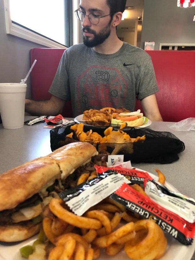 The minute we walk in we become aware of two things: one, that we look and smell terrible, and two, that we are the only people in the entire establishment wearing masks. A group of unmasked older folks at a table openly stare at us as we walk in the door. We’re deep in Kentucky, a vividly red state, where the people are kind at face value but obviously distrusting of outsiders, particularly smelly hippy-looking outsiders wearing masks, one of whom has a a pack with Sharpie notes all over it that say things like “Black Lives Matter” and “singular ‘they’ is at least 600 years old.” I’m a little nervous. I walk to a booth as quickly as I can.
