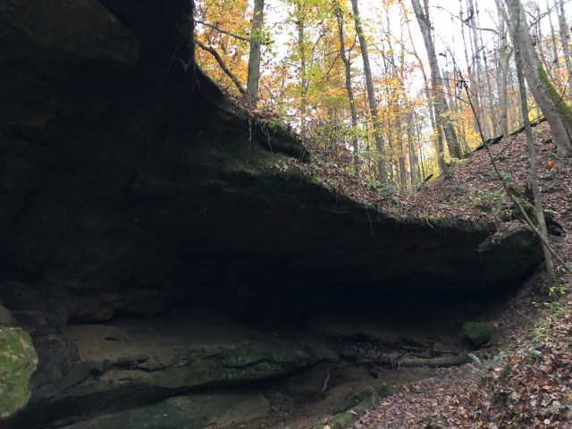 Though we haven’t technically seen much of Zaleski yet, I am impressed so far. The trail meanders over easy hills, next to wetlands, and up to elevated campsites with fresh water sources. There are mushrooms and dramatic caves below trees shedding the last of their autumn yellows. Despite the gravel issues the campsite is nearly-ideal, with a fire ring and perfect sitting logs. It’s supposed to rain steadily all day tomorrow, but somehow I think it will still be good.