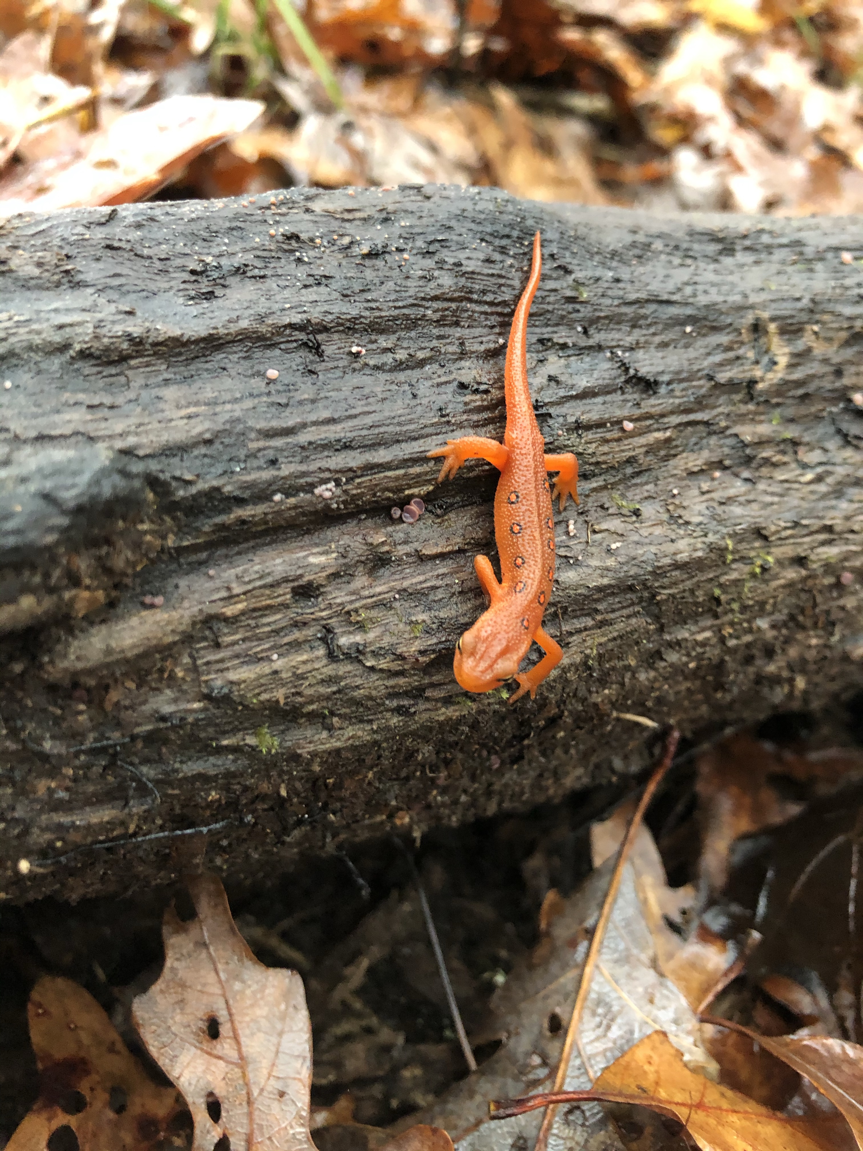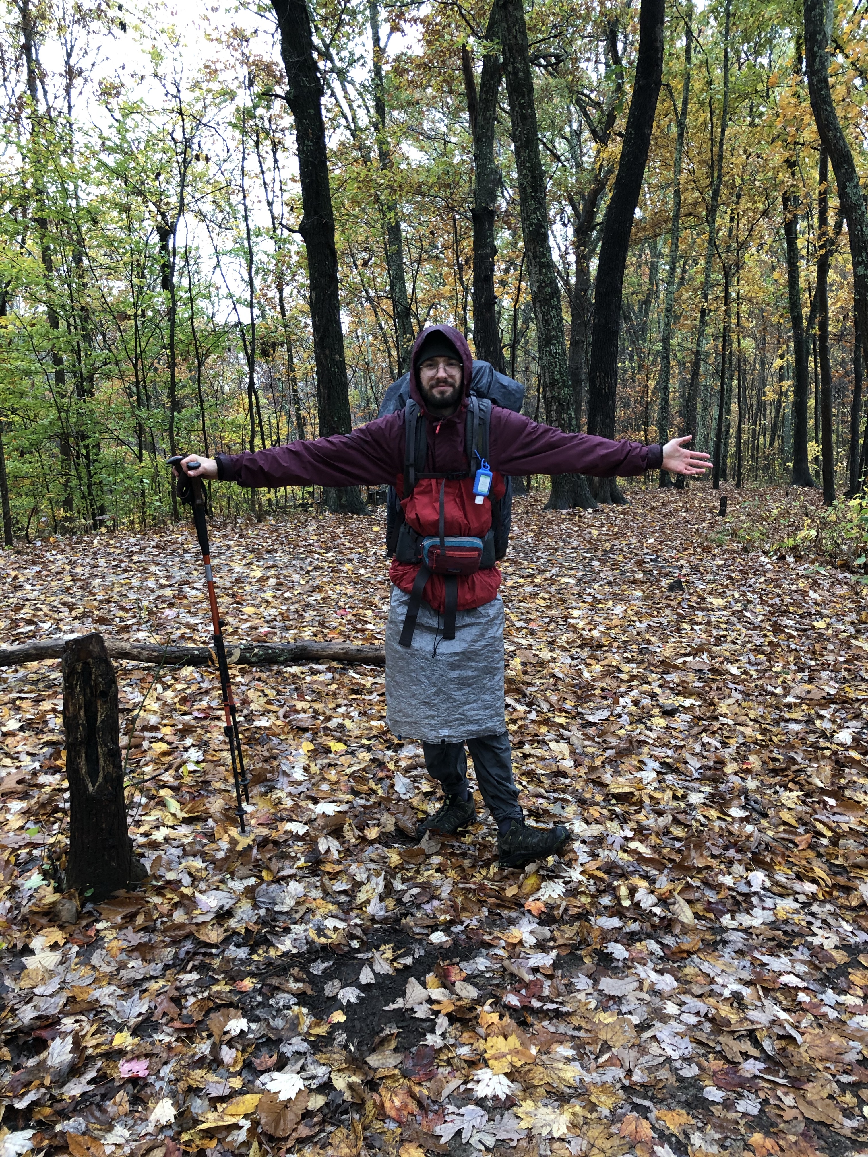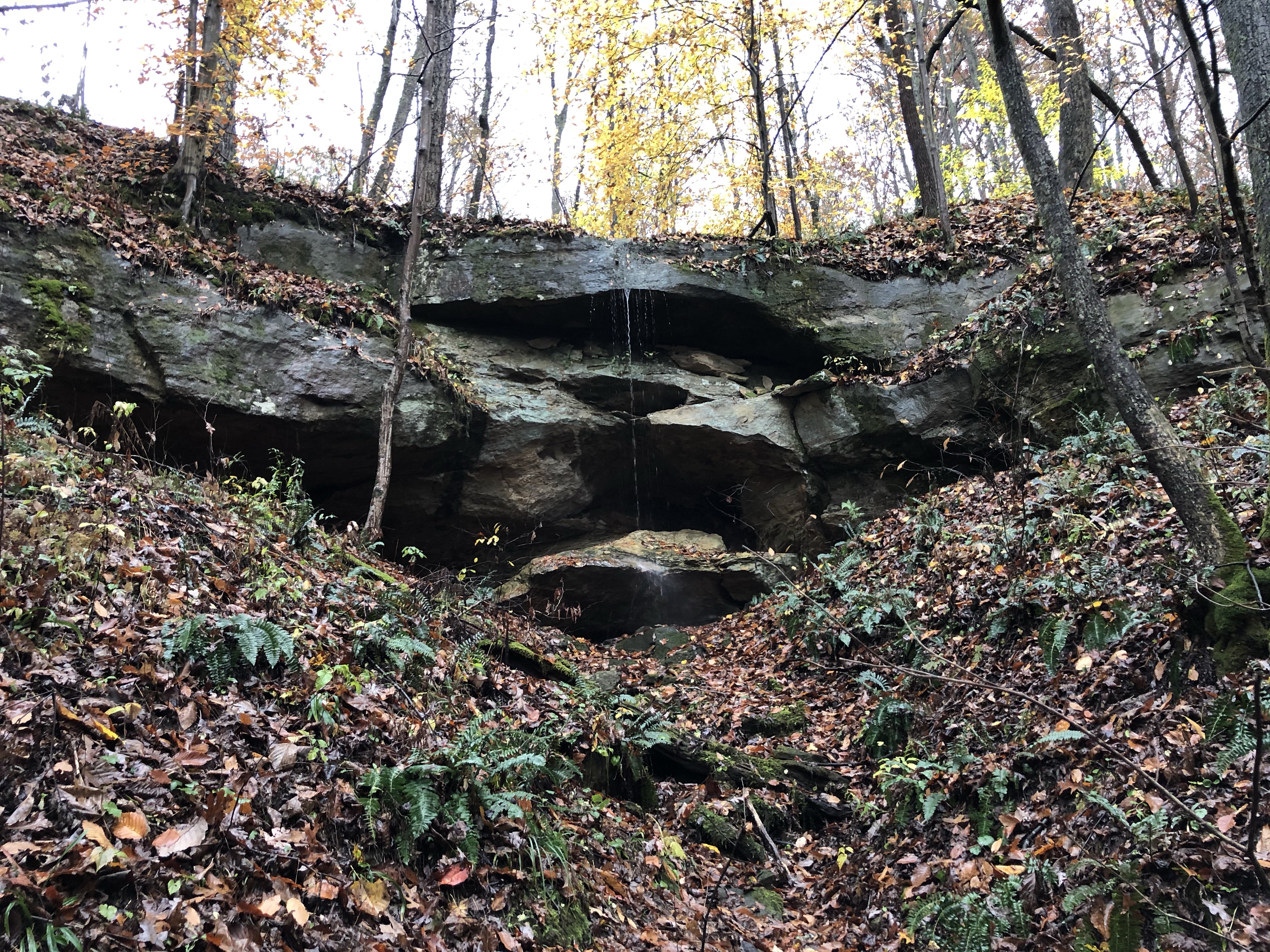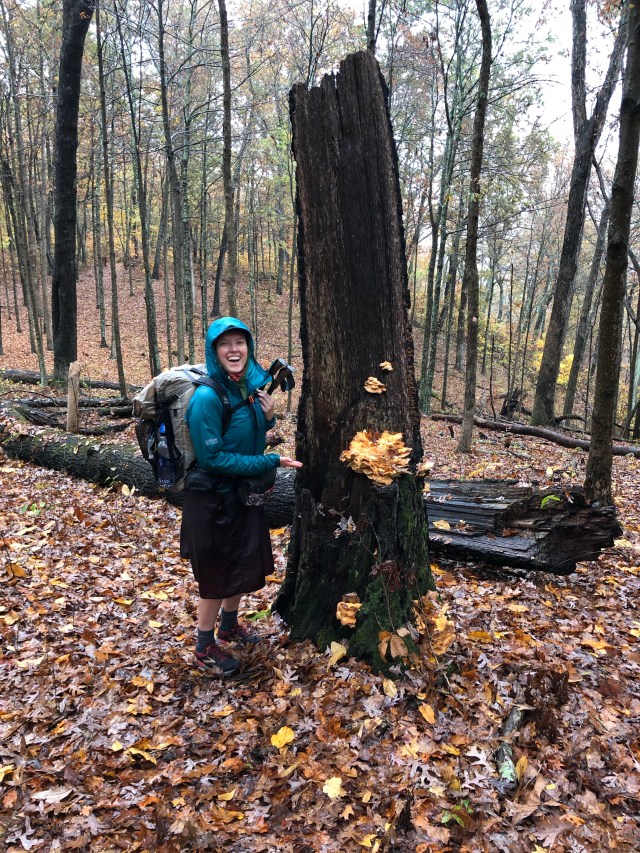 Zaleski looks similar to Shawnee. That’s probably not surprising, considering that both are in southern Ohio, which in late fall is characterized by rolling hills, wet rocks, and deciduous trees in the last throes of autumn colors. But there are fewer ups and downs, and it didn’t really feel all that difficult for the most part. There were numerous caves, waterfalls, rock formations, pretty creeks, and cliffs with views across valleys. We also found a large flush of chicken of the woods growing on a dead tree. It turned out to be past its prime, but I was glad to have finally found some after looking for it all fall.