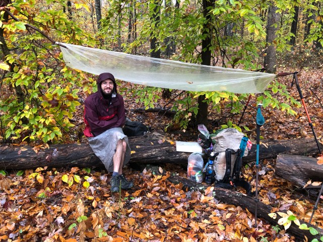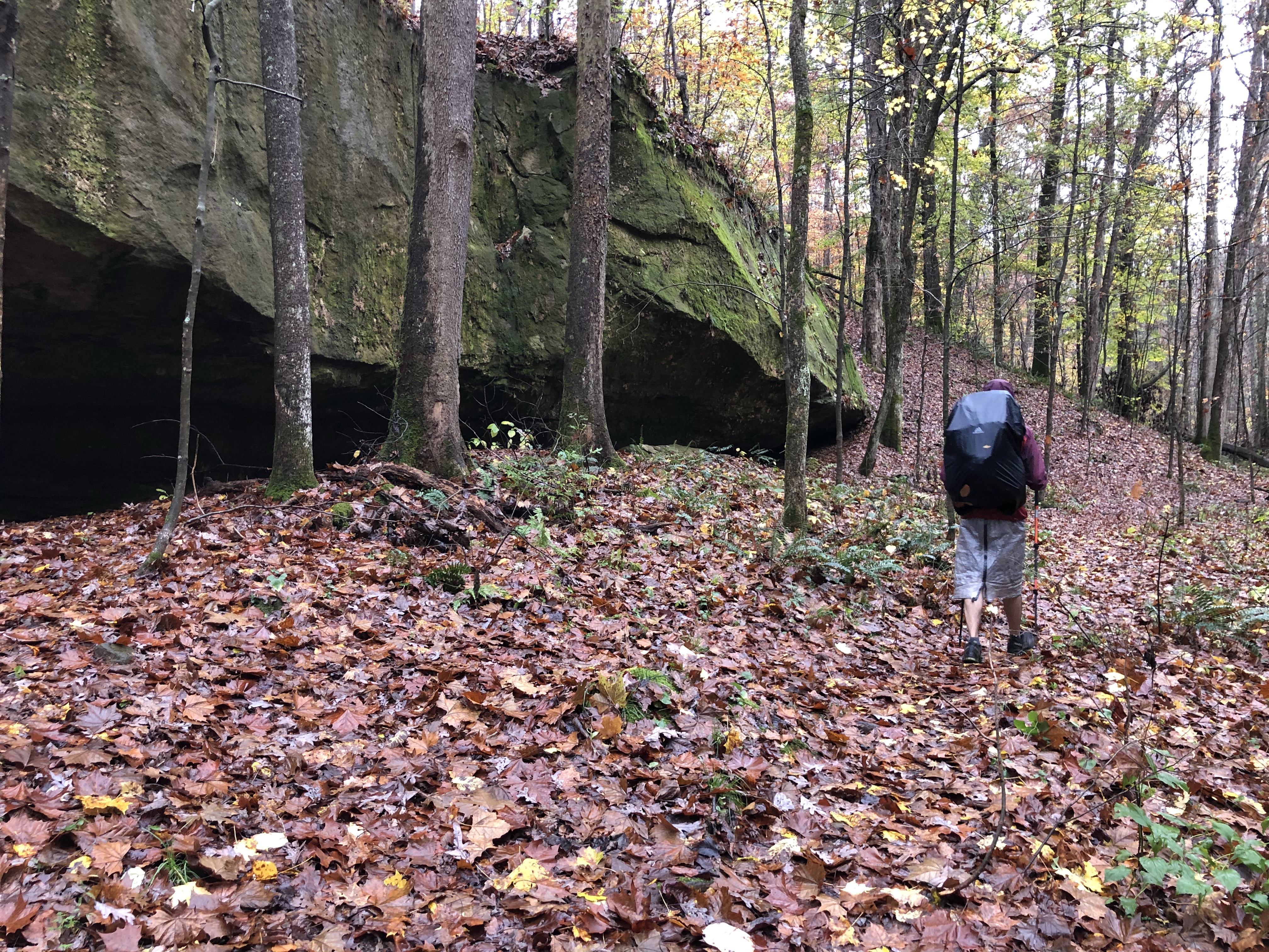 We stopped for lunch on a log under a couple of young beech trees. It was still drizzling, so we made a little canopy for ourselves by tying the corners of my polycryo ground sheet to the branches. Within moments of stopping, the chilly air bit through our wet clothes and my feet stared to go numb. But we brewed some hot lunchtime coffee and it tasted like the warmest, most comforting thing in the world. Immediately after we started walking again after lunch, we found a cave with a massive overhanging rock over a dry fire ring. It would have made a perfect lunch or camping spot. We considered stopping there for the day, but it was only 3:00 and we had so many miles left in us. Ah, well. Such is backpacking.