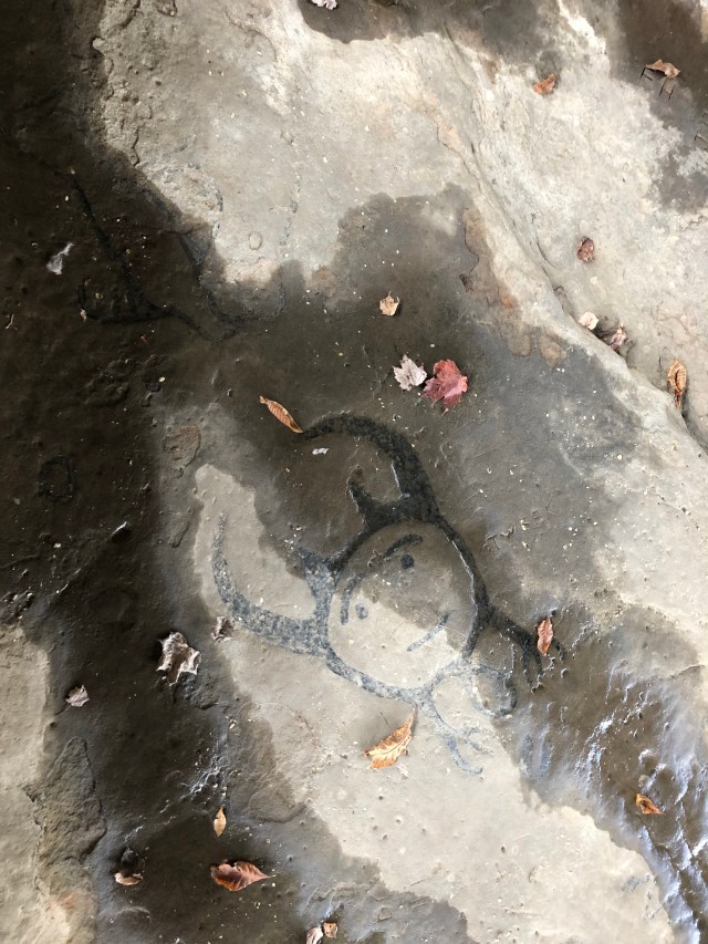 After completing our little Zaleski State Forest backpacking loop on October 30, we loaded up in Wiggs’s car and hit the road. We did not go straight back to Columbus, however. Instead, my very nice boyfriend agreed to reroute half an hour west so that I could visit three Ohio History Passport locations: Leo Petroglyphs, Story Mound, and Logan Elm.