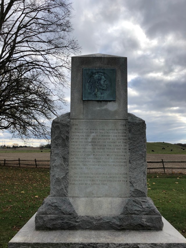 Today the site of Logan’s speech is marked at Logan Elm Memorial. The elm tree under which Chief Logan spoke has long since died, but the site of the speech is marked and a new elm has been planted. It is a field of monuments to Logan, his speech, his family, and his people. It was cold when we were there, and the wind cut across the open field and through our layers.