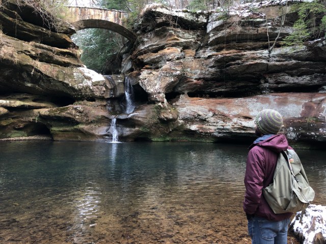 December 18 was one of my last days in town before heading home for Christmas. As a college writing teacher, I was also in the thick of grading final papers and managing a flurry of panicked emails before grades were due. I was stressed out. We debated the merits of going when Wiggs and I both had so much to do, but we ultimately decided that one never regrets spending time outside. So, although we got a late start, we still made the trip, and I am so happy we did. Wiggs drove, I stress-crocheted, and Collin sat in the back peacefully consuming a tray of cinnamon bites from Taco Bell on the hour and a half drive to Hocking Hills.