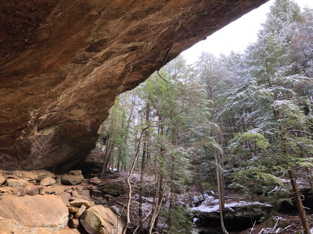 It wasn’t a particularly sunny day, but it had just snowed, and a graceful dusting of white covered the trees and grass. The highway ended and we made our way down a winding road, stopping at the Hocking Hills Coffee Emporium for a cozy cappuccino and snacks. When we got to the state park it was nearly empty, considering that it was winter and a weekday. It felt like we had the place almost to ourselves.