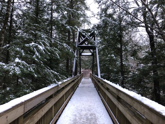This trail is smooth, flat, and wide, and since it is in the woods above the creek rather than down among the rocks, we covered the distance more quickly. Though it is arguably not as scenic as the trail down in the gorge, it is still beautiful, and it was especially beautiful in the snow. There was an overlook out towards the hills on the other side of the valley, and the pines and hemlocks were dusted with a light, frothy layer of snow.