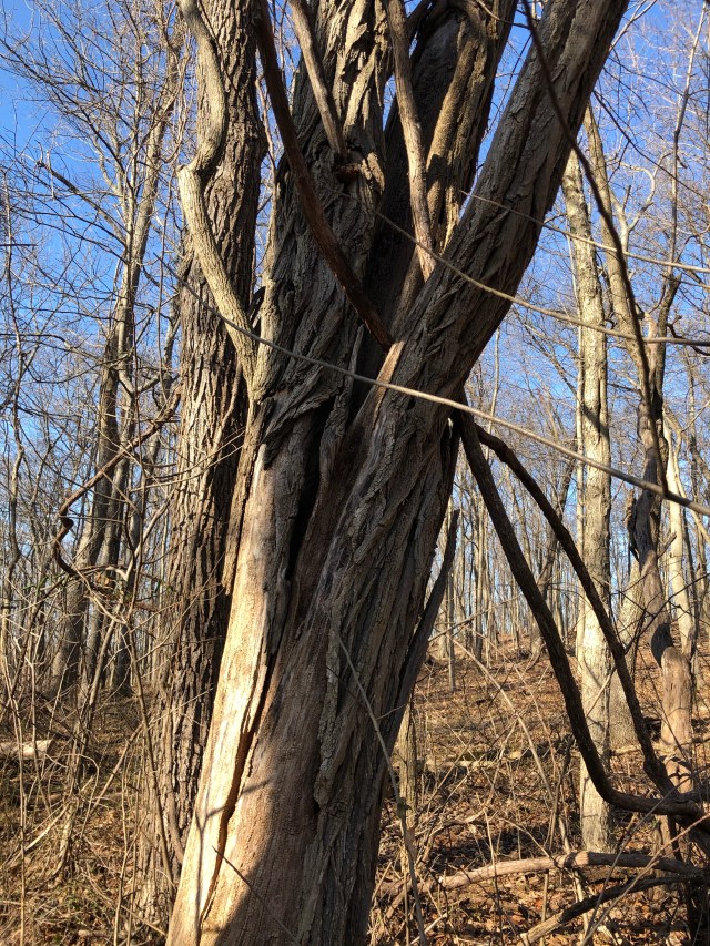 Our plan was to take the Sugarloaf trail to the Shawnee Ridge trail. We found the trailhead right by the campground entrance, and upon entering the woods, I felt that familiar sense of settling and relief that comes with being among the trees. I knew it was too early for mushrooms to be popping out, but I kept finding myself with my eyes glued to the ground, searching for the bright red of Sarcoscypha sp or, even less likely this early, a morel. Nothing mycological showed itself to me on this day, but we did spot a number of auspicious trees that may prove fruitful come April.