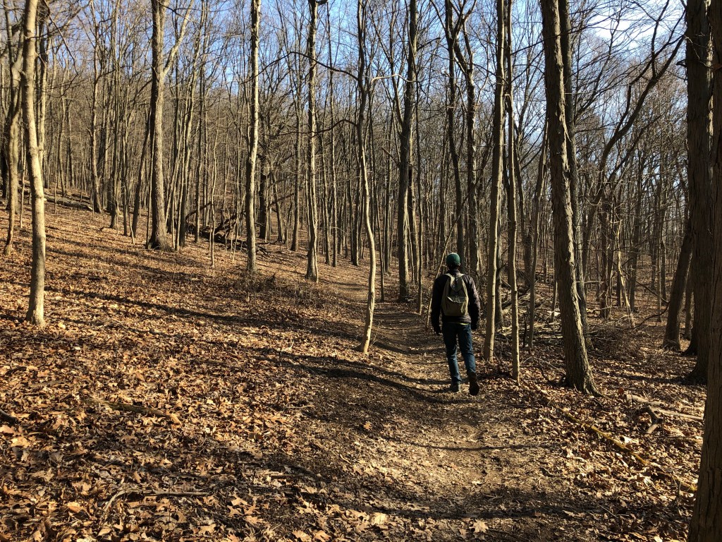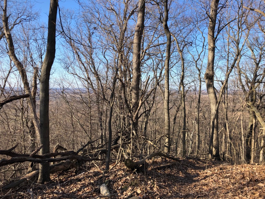 There isn’t much of a view from the summit, but since the trees were still bare, we could see fairly clearly down towards the plains and north to Columbus. We could also see other wooded ridges to the south and west. We took it all in for a moment, and then continued down the equally steep downhill on the other side.