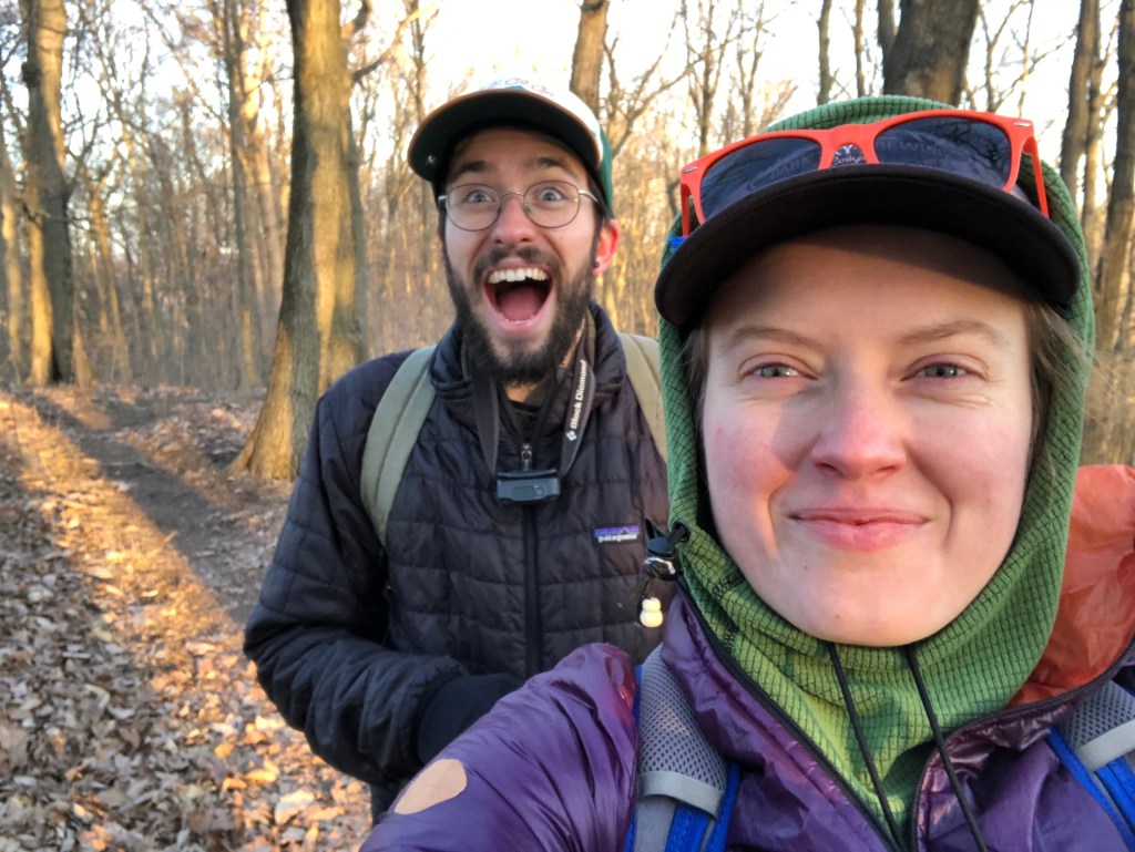 At a fork we took a right turn, which ended up putting us back at the campground. We turned around, realizing our mistake, and continued past the fork up to the Shawnee Ridge trail. The path wound its way around the sides of the ridge, then down into the valley and across creeks, before climbing Bald Hill. It still felt like winter here, and no green leaves were peeking out yet. We did, however, see a large herd of whitetail dear and, adorably, a chipmunk poking its little head out from a hole in a log.