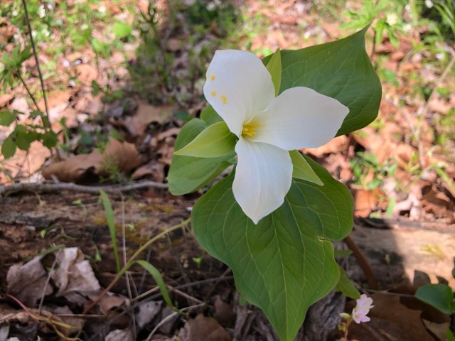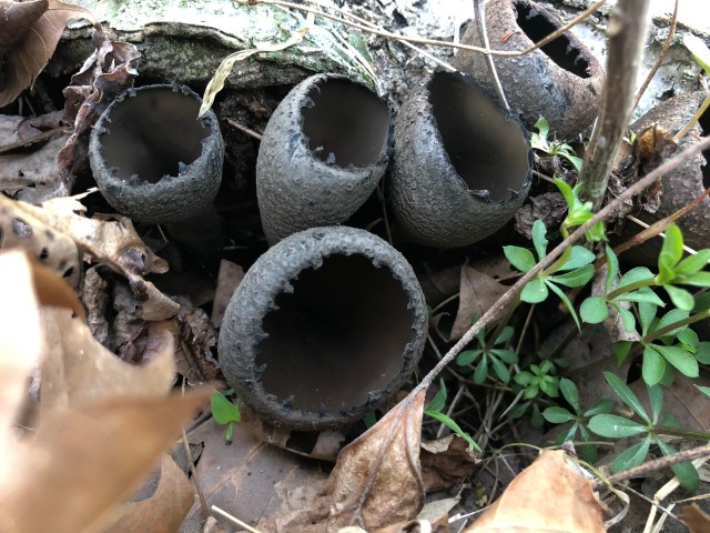 I was not successful in my morel hunt, but I did find a colony of mica caps about to emerge from the ground, as well as the most perfect cluster of devil’s urn, Urnula craterium, I’ve ever seen. There were mosses and ferns galore on the west side of the loop, and I stopped at nearly every tulip poplar to prowl the ground underneath. I officially gave up trying to find any Morchella. It didn’t really matter, since I was outside, in a beautiful forest, among the wildflowers.