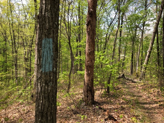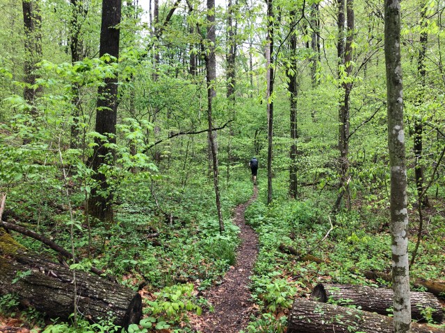 This loop isn’t particularly scenic, as in, there are no real views apart from a brief break in the trees which provides a vista of another hill in the distance. It is very lovely, though, especially the parts that wind through vibrant green valleys with the trail following a creek. There were some decent climbs as well—not Appalachian Trail level, but certainly on par with Shawnee State Forest.