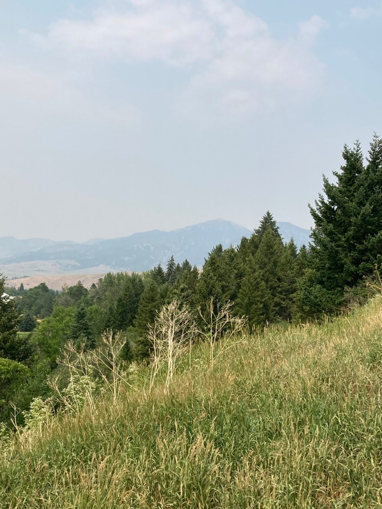 From the top of the hill you can see south to the Gallatin Range, which I’ll be hiking, and north to the Bridger Range, where there’s a ski area in the winter. It was really, really smoky today, though. It has me a little worried about what it’s going to be like in Hyalite. But I guess I’ll find out! It’ll be beautiful no matter what, but I might need to be more careful about pacing myself so that I can breathe.