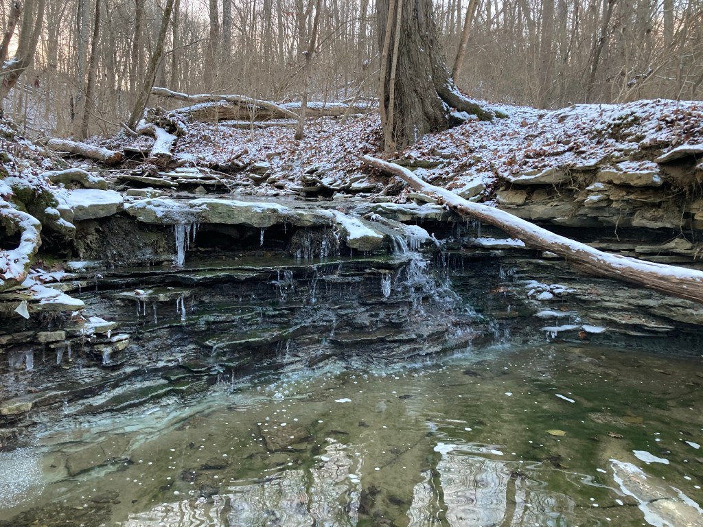 I walked up onto the Screech Owl trail, then the Fossil Trail, and finally the Coyote Trail. I crested up the side of the hill and dropped down to the waterfall on Moser Branch Creek. There were icicles on the edges of the falls, and in the middle, the stream tumbled downwards. I took a deep breath, savoring the evening now dipping into twilight, the sky getting more orange and pink.
