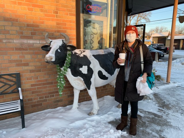 It was 3 degrees this morning. Frosty! I am very proud of how I got up before 7 and survived without coffee for a whole half an hour before we stopped at The Baker’s Wife pastry shop for breakfast sandwiches, pastries, and coffee, all of which were delicious. As a bonus, they had a very nice cow statue outside. I got KG to take a picture of me with it.