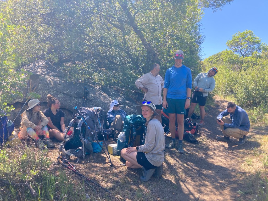 I stop and load up on water at a flowing creek. There, Rolling Thunder, a long-time friend of Scout and Frodo’s, joins Andy and me, and the three of us hike together for the rest of the day. The conversation jumps from English slang to trail stories to all sorts of other topics. We take a few breaks to appreciate the views, then we find a lunch spot in a shady patch of dirt.