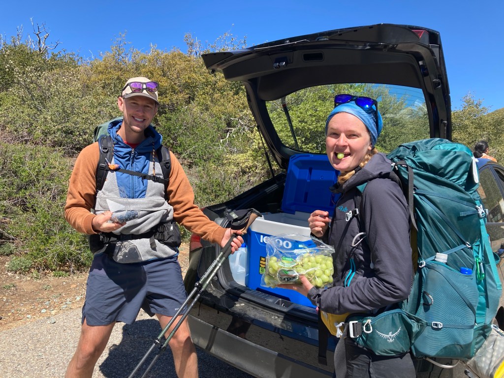 It’s mostly ridge walking today, occasionally flowing uphill or making a downward turn, but always with beautiful scenery. We cruise the first five gorgeous miles to the Pioneer Mail picnic area, where we set up our tents, chat with a few hikers we haven’t seen yet, and eat a snack. As we’re headed back to trail, a car pulls up. “Do you want some fresh fruit?” I hear a voice ask.