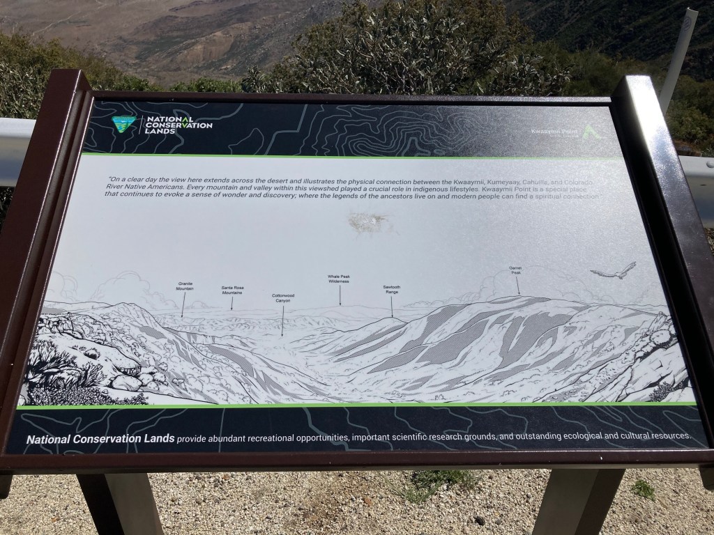 It ends at Kwaaymii point, where a sign discusses the importance of this place for the Kwaaymii, Kumeyaay, Cahuilla, and Colorado River Native Americans. I can’t recall seeing an interpretive sign anywhere else on a trail that directly referenced the original peoples of the land in the United States, and I appreciate this nod to the indigenous communities on whose ancestral homes we are walking. We can only walk on these lands because they were violently removed from them. It’s good to remember that.