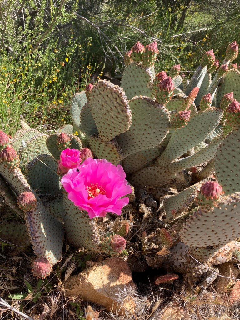 The light is so beautiful as we continue downhill. I love this time of day, 6 PM, in the desert. Everything is golden. We pass more prickly pear blossoms. We talk a little. We look at the shadows of the clouds passing over the far mountains. The trail has no right to be this beautiful all the time.