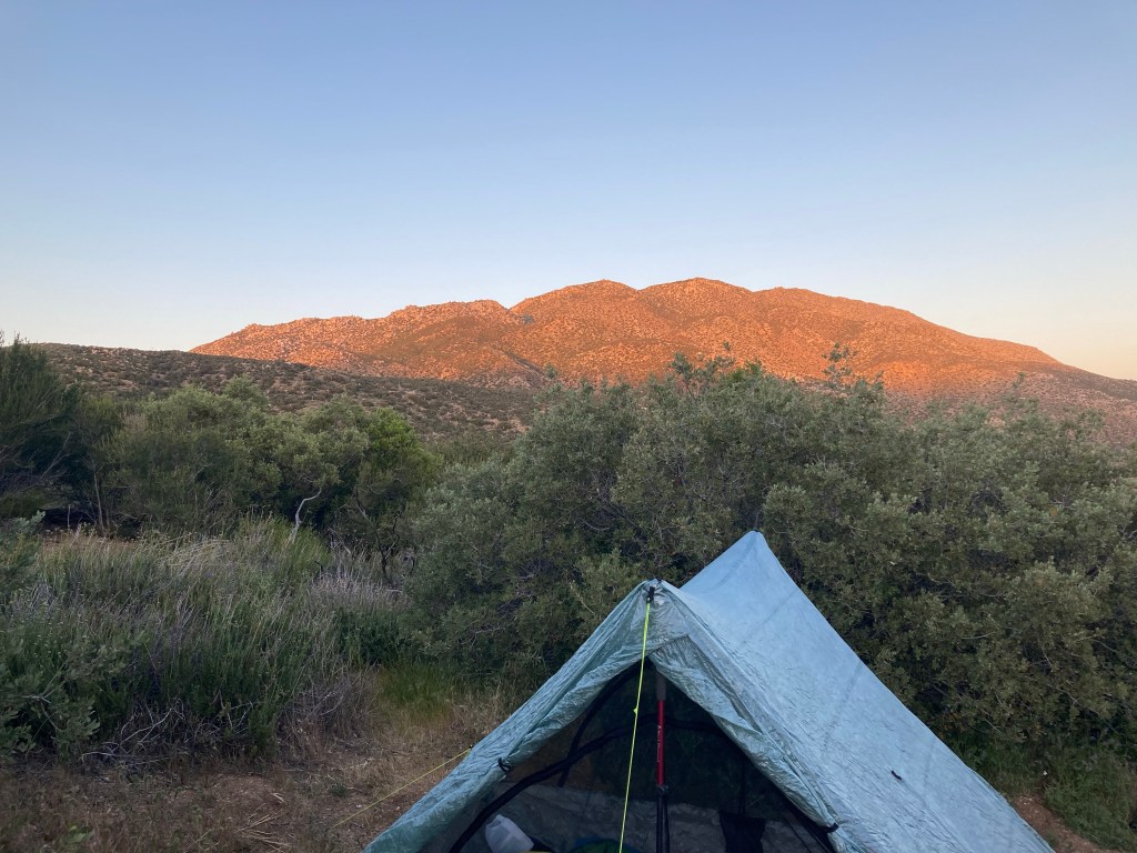 We make it to our camp and exhaustedly set up our tents. We have dinner with a few other hikers who are here. Their names escape me at the moment, but when I have more brain power I’ll remember again. I have tea, then Petra gives me her White Claw that she decides she doesn’t want. Definitely going to have to get up tonight. I stand and look at the fading light on the mountains in the distance for a while. I brush my teeth. I hope I sleep well, and I hope I feel more put together, pleasant, and present in the morning.