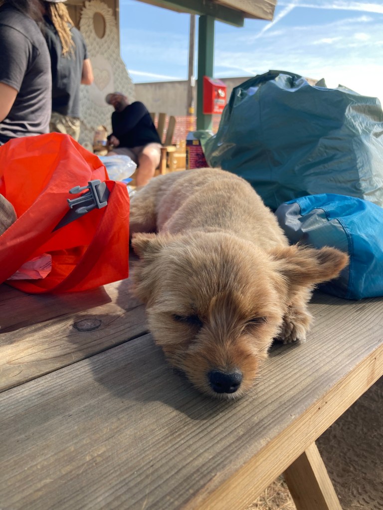 We eat prepackaged sandwiches at the picnic tables outside the store, charge our devices, and visit with Ellie the hiking dog, who is extremely cute. Then that thing happens again where Petra and Andy are ready to go and I am Very Much Not. I still have to get water, organize my electronics back into my bag, and fill up my bottle of hand sanitizer because it’s four more days to Idyllwild and I’m almost out. Flustered, I go to get water from a tank out back, hurriedly filter it, then pile into the shuttle again. It’s not until I get to the trailhead that I notice that my hand sanitizer bottle isn’t where it usually is on my pack. “It’s on the front,” Andy says. It’s completely full.