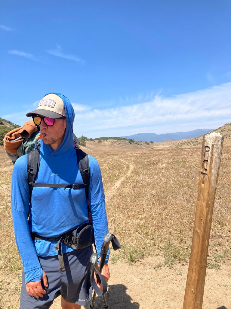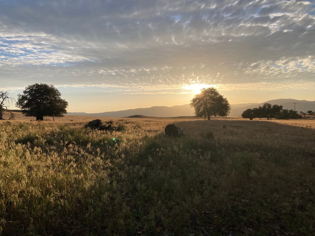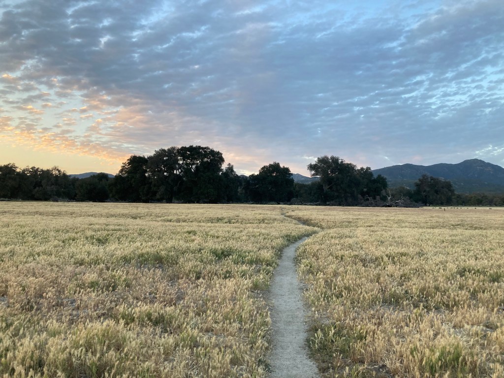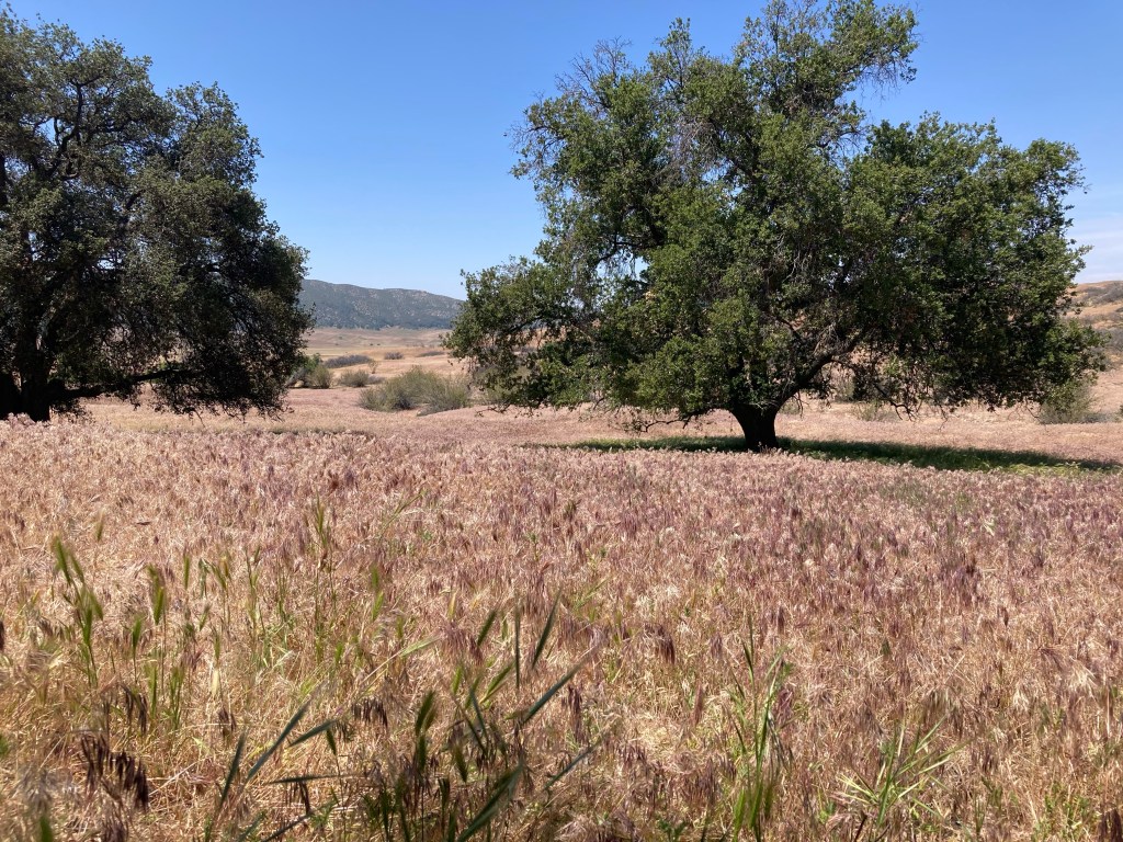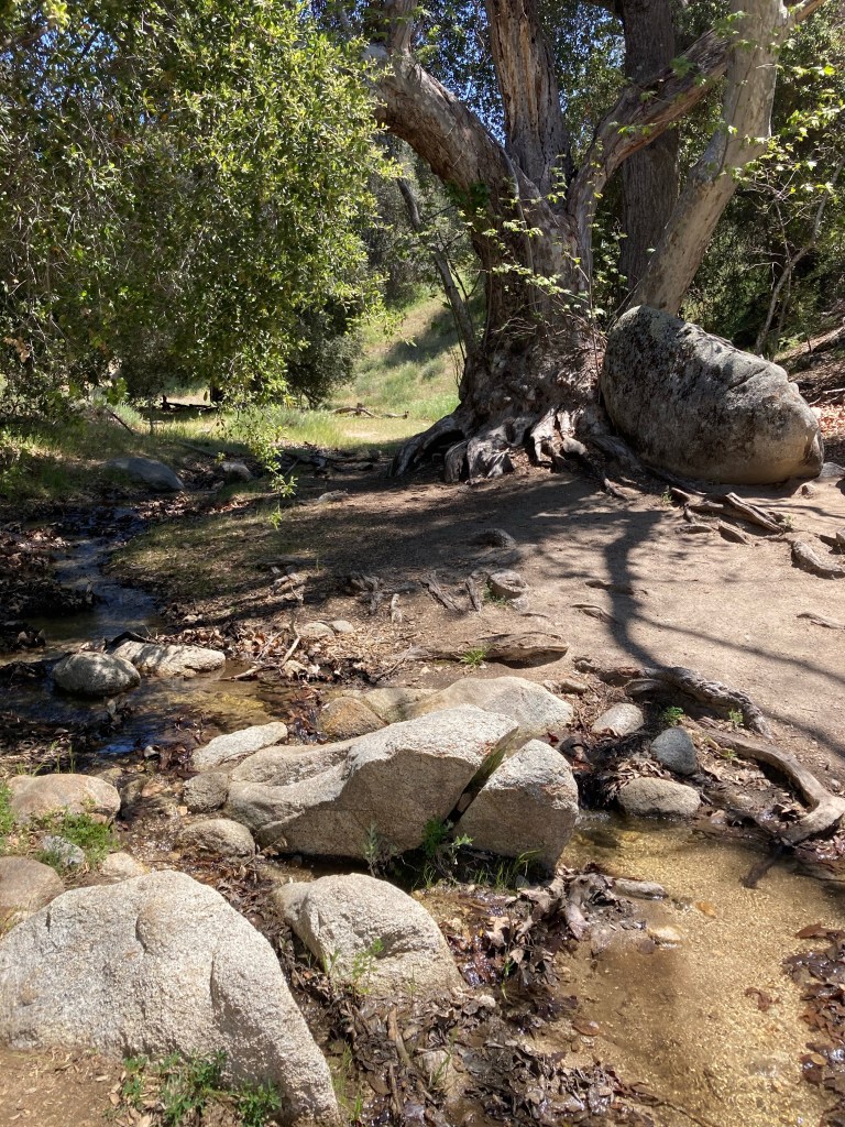It’s so hot though, and there is no shade. The trail curves through some scrub oak and then down into a grassy meadow broken occasionally by cows and huge trees. I don’t have that much water, and I’m trying to conserve what I do have. We take a break in the grass under a tree, and I eat some food simply for the sake of not carrying it. Then we continue along a lovely flowing creek, where I filter some more water and put my Buff headband and hat in the stream, then put them on. I can almost feel my body temperature decrease by several degrees.