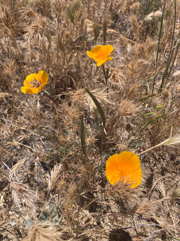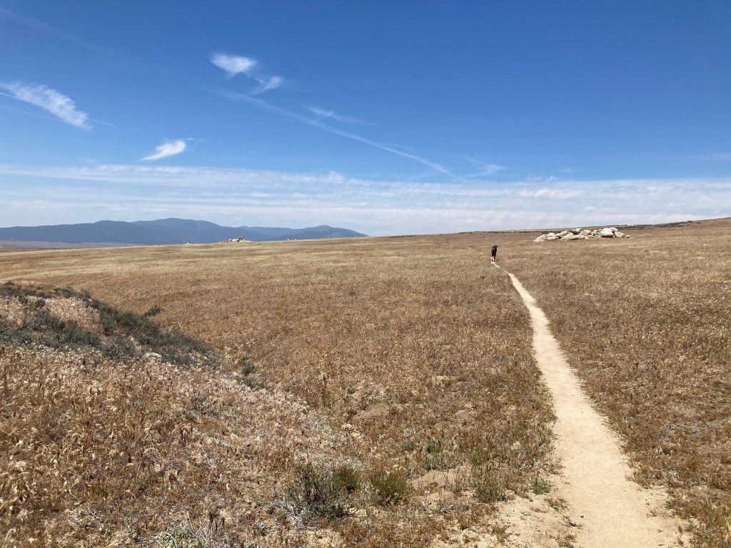 Soon after that, I go uphill and then wind up in another huge grassland as far as the eye can see. There are occasional boulders strewn across the expanse. I follow the little path, watching the wind sift through the grass and poppies. I put my arms out and almost feel like I could take flight.