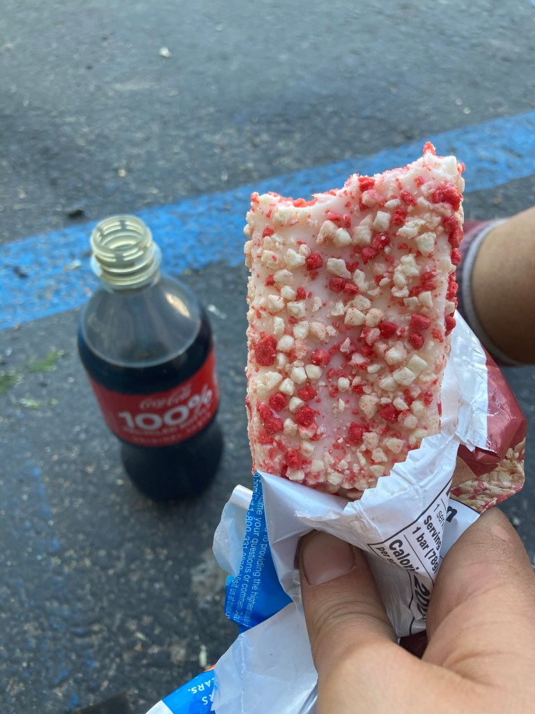Finally, Petra and I go into the post office, get our boxes sorted out, and re-pack our food bags. Then we go next door to the gas station. I get a Coke, an ice cream bar that I come very close to dropping, and a water bottle to replace my mysteriously disappeared one. A trail angel comes by and offers us a ride back to the trail in half an hour. Of course, he comes back when I’m in the bathroom, and Andy has to come hurry me up to hop in the car, where everyone is waiting for me. Why. WHY.