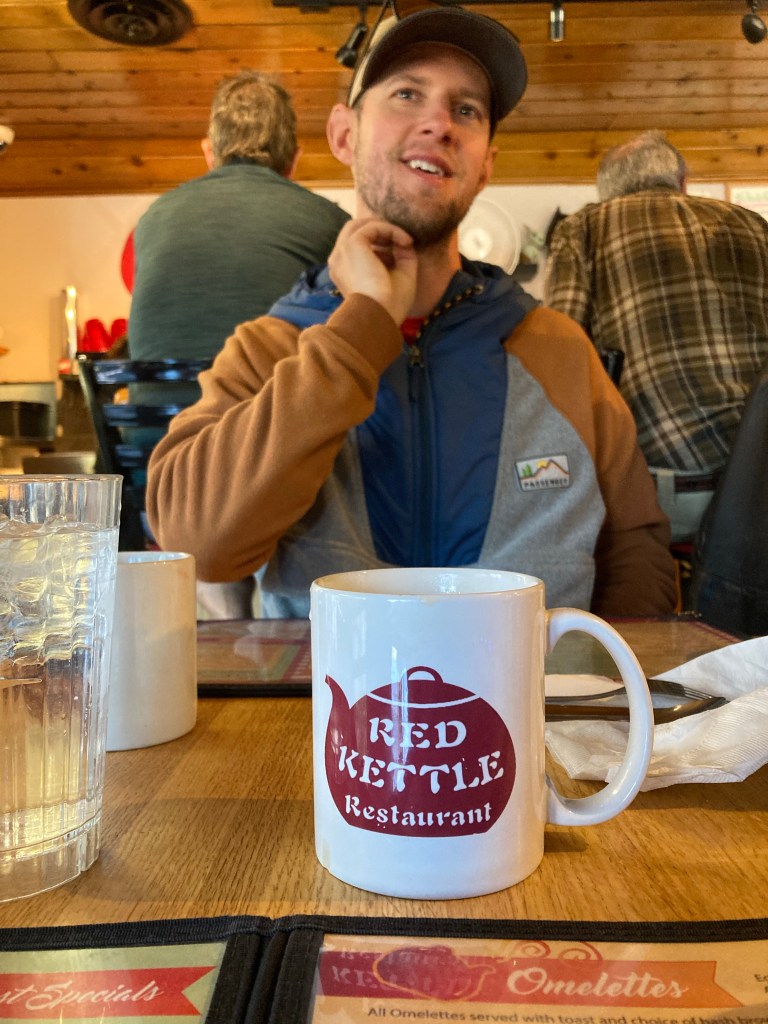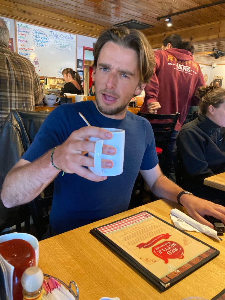 After a good bit of faffing around, we make our way to the Red Kettle diner. DLT, who is from the midlands of England, is absurdly excited for the American diner experience, especially the bottomless coffee. Surprisingly, we get a seat as soon as we get there. We sit down and order coffee (my first real coffee since February! It makes me feel terrible). Then we order large breakfast combos. I amaze myself by eating two pancakes, two scrambled eggs, two sausage links, some of DLT’s French toast, and two pieces of sourdough with jam. 180 miles in and I already have hiker hunger? I feel disgusting and I love it.