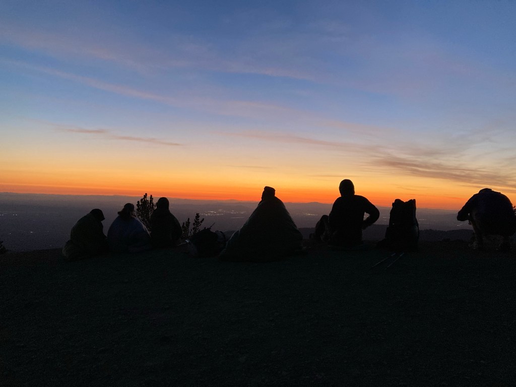 Catless, Petra, and Chicken are there, along with the hikers we saw at the road crossing yesterday. They’re sitting at the top of the hill looking towards the sunrise. We join them and watch as the world slowly gets lighter. It’s pink and orange and deep blue, and it is so beautiful over this mountain range. LA is visible in the distance, planes taking off and landing at LAX. Somehow, it doesn’t take away from the beauty of the mountain but rather adds to it. Nature and humanity: both cool, not so different.