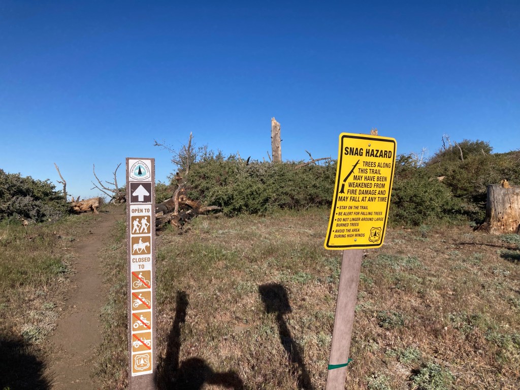 At the summit, I take a photo of a sign warning hikers about unstable trees, then notice that my achilles is talking to me a bit. I take a moment and stretch it out, then choose another song. At this point, I’m resigned to the fact that I will probably not see Andy and Beetle until Acton this afternoon. I plan to stop at the next campground for a snack and privy break. I start walking as the hill turns downwards.