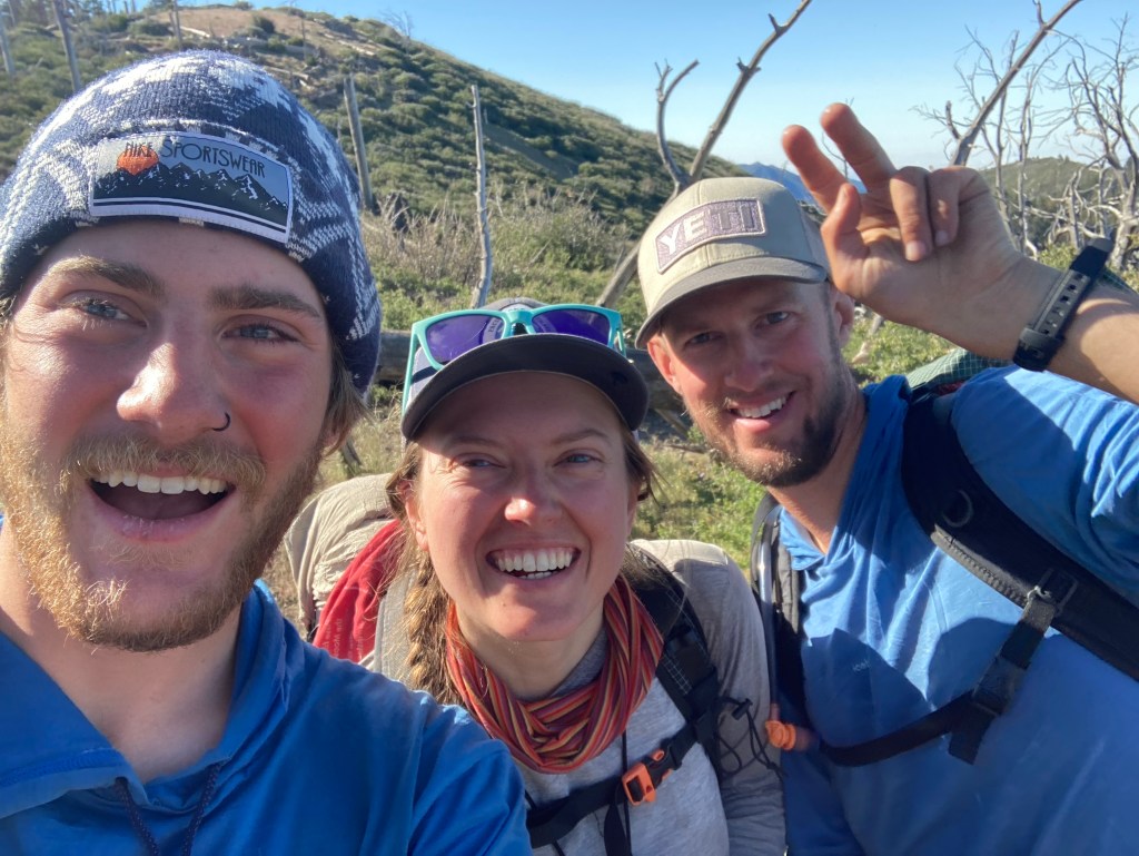 Five seconds later, I see two blue sun hoodies. “Oh!” I say, surprised. It’s Andy and Beetle! They’re sitting under a dead tree eating oatmeal and drinking coffee. It’s not even 8 yet and I caught them! I am so excited that I get all tangled up in my headphones and thrupack straps and, obviously, my water bottles fall out of my back and tumble over the ground. Once we have that out of the way, I give both of them huge hugs. It’s only been a few days, but it feels like much longer. I’m so happy to see them again!