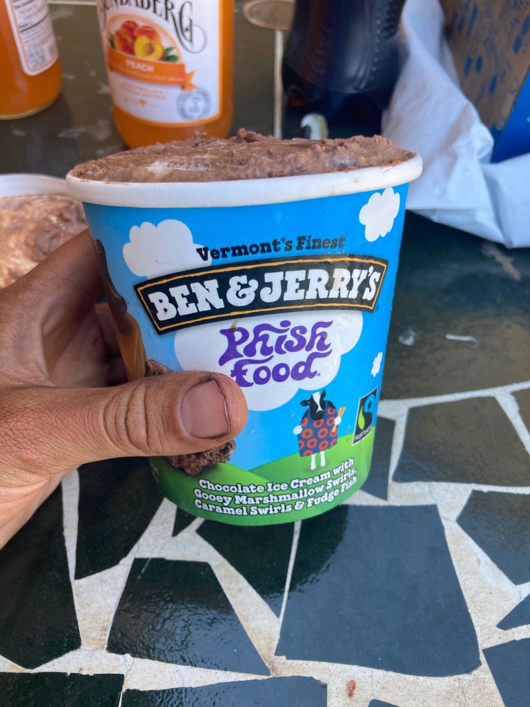 Once I’m in the air conditioning and surrounded by cases of cold drinks, I immediately feel better. Andy has been hankering for a cherry coke, but he notices a row of Bundaberg sodas, including a peach one. That just sounds plain delightful to me, so we both get one. Then we find the regular soda section and I also buy a cherry-vanilla Coke. Then I decide to get a pint of Ben and Jerry’s Phish Food, because why the heck not. Outside the store there are a few tables, and we sit there consuming sugar, updating social media, and just generally being trash for hours. It is delightful. I’m a cannoli of dirt, sweat, and sugar, and I am so damn happy about it.