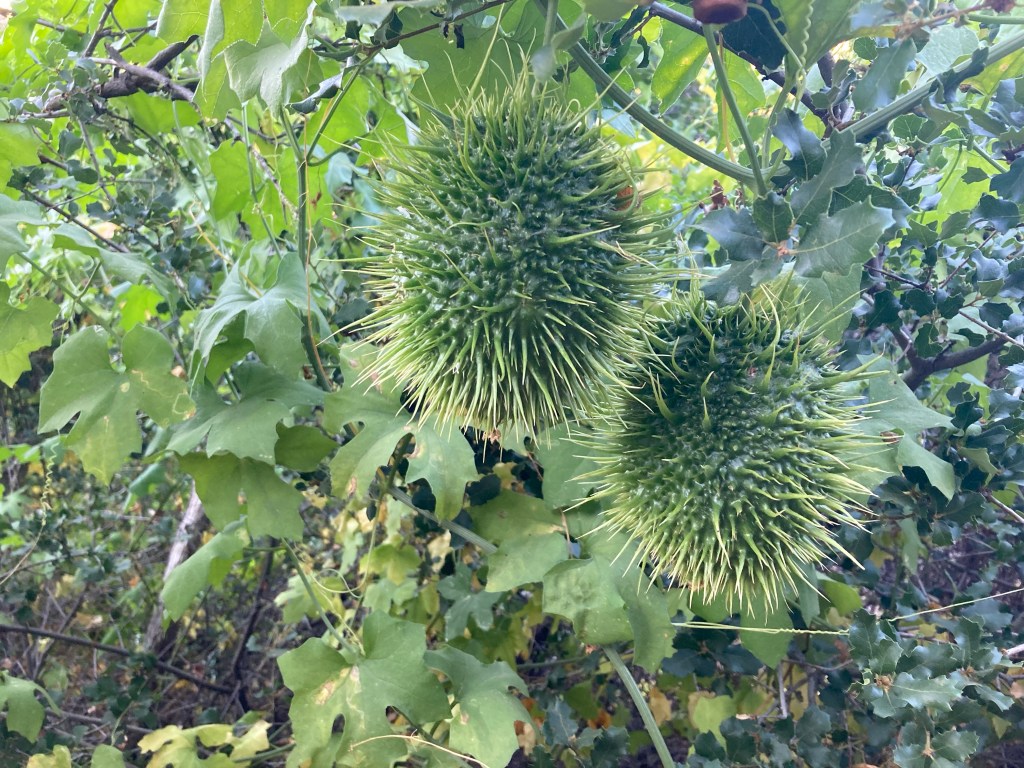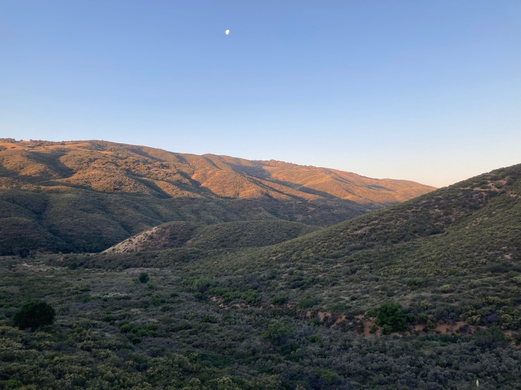 After that the hill is pretty much done, and we enjoy a smooth, cruisey few miles into camp. I keep noticing these plants with spiky green fruits, and I find out from my PictureThis app that it’s a wild cucumber. They look so alien. Neat! I keep meaning to look up a bunch of the plants I’ve found whenever I have service, but I always forget. It’s good to know this one.