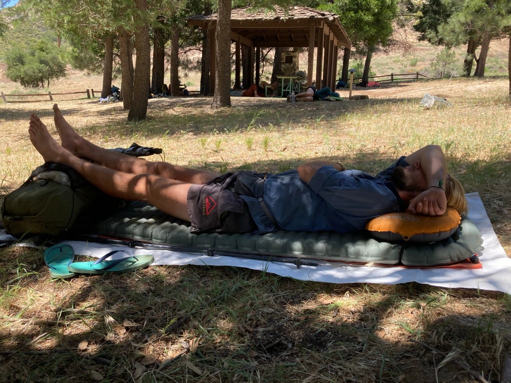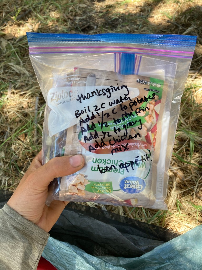 I set up for nap time under a pine tree and pass out almost immediately. When I wake up, there’s a huge group of sleeping hikers spread out all over this area. That’s how you hike when it’s stinking hot, I guess: big miles in the morning, fat nap, more miles at night. I’m hungry again when I wake up, so I make one of my pre-packed Thanksgiving dinners that I put together before I came out. It’s very heavy and gross-looking, but it tastes amazing.