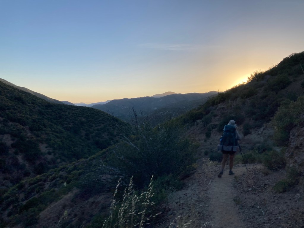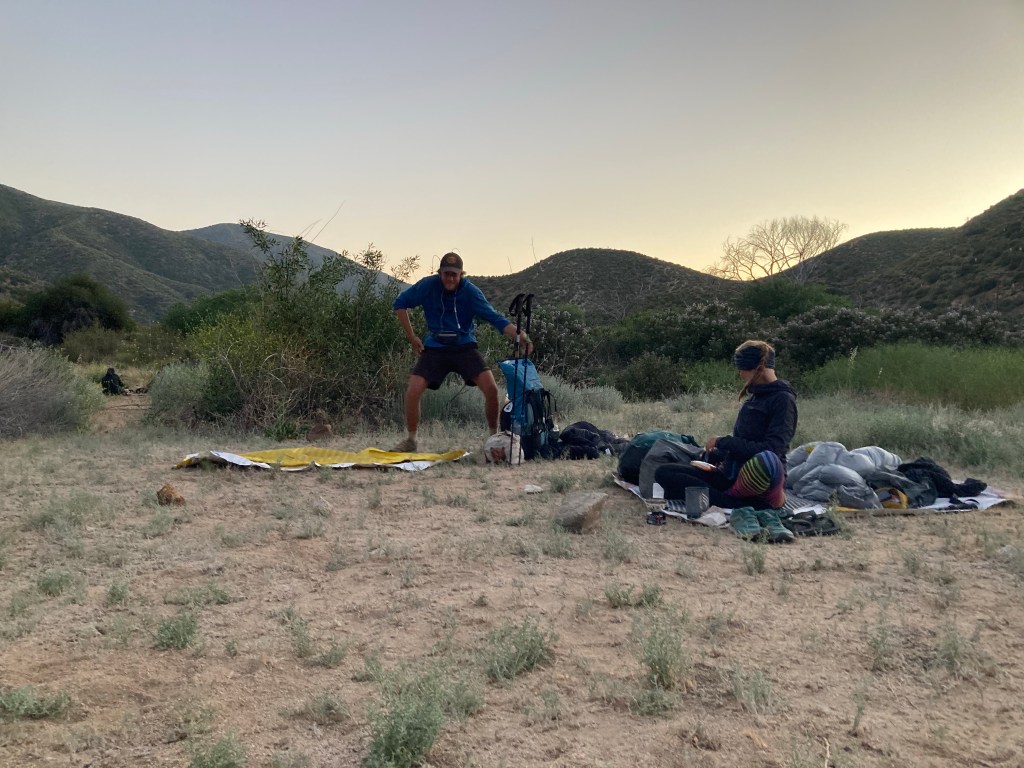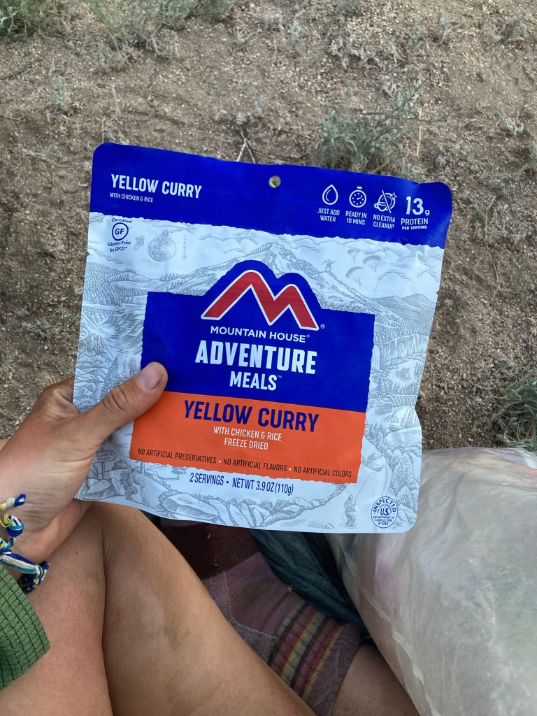 It’s not long before we run into Petra and Catless. We walk more or less together for the last mile to camp, right before Lake Hughes Road. It’s a lovely clearing surrounded by bushes. We set up for cowboy camping in a circle, and soon we’re joined by Power Plant, Knuckles, and Topo. It makes me so happy to be sitting here in a circle with my trail friends beneath the mountains. I eat a Mountain House yellow curry, which is objectively the best backpacking dinner I’ve ever had (shoutout to Andy for discovering his gem), followed by some dried mangoes for dinner. Backpacking, man. It’s the simplest and most beautiful thing.
