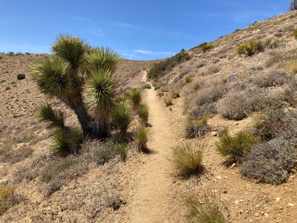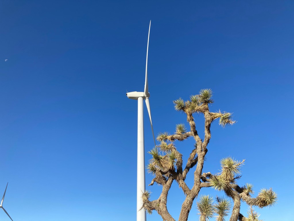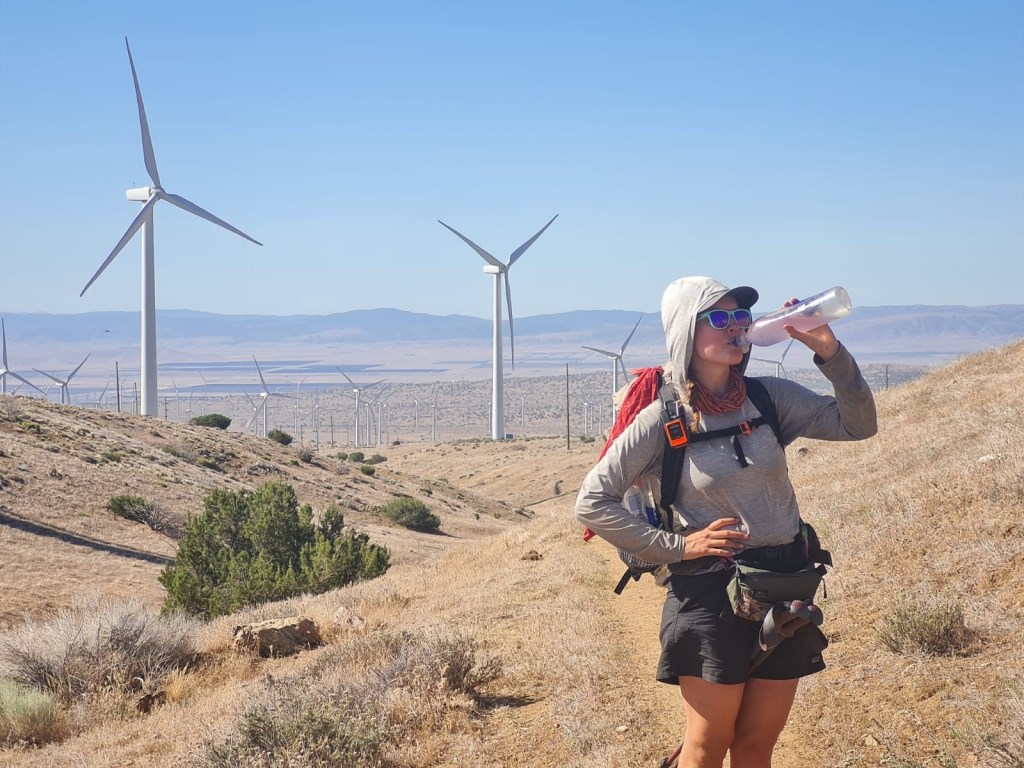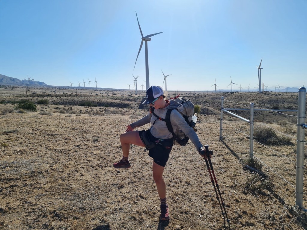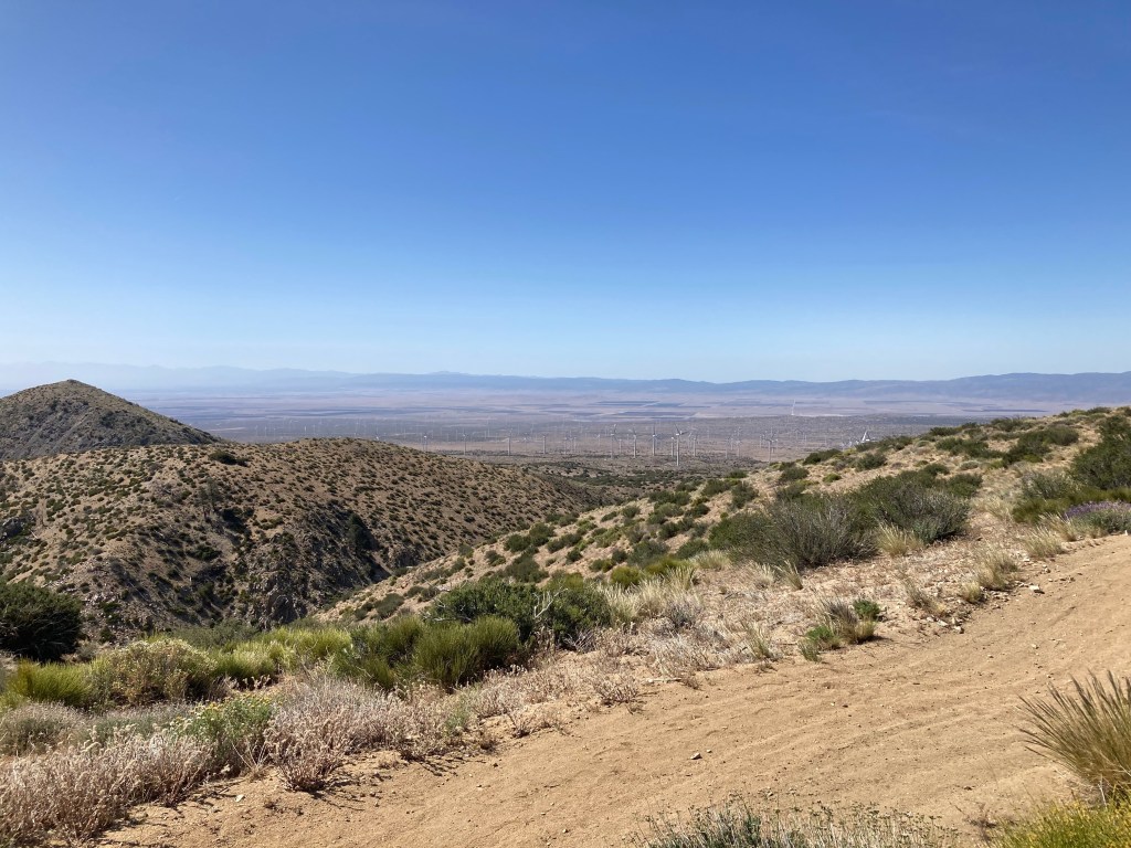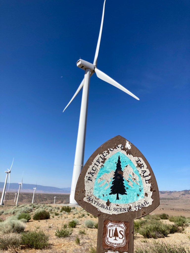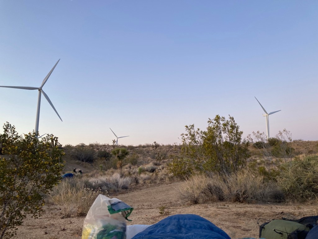 It’s slow going this morning. Luckily, the first part of the day is a very gradual uphill, so gradual that parts of it feel flat. DLT walks slowly with me as we move through the turbines and Joshua trees. I have to stop a few times within the first couple of miles to stretch out my hips and achilles. I am SO tight. I can’t wait for a double zero in Tehachapi. I’m going to stretch and roll out EVERYTHING.