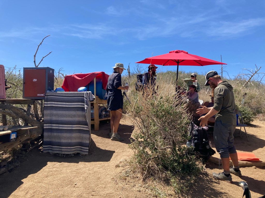 Finally, I round a corner and see two red umbrellas and what looks like a cooler. Is this trail magic? Turns out that it is, in a way! It’s a water cache, pantry, and little library maintained by a local trail angel. I walk up and see DLT, Rob, and a huge group of other hikers sitting under the little bit of shade that the umbrellas provide. My brain is fried when I get there and I find conversation impossible, but after two packets of Spam on tortillas with chip drink and a liter of water, I feel ready to be at least marginally human again.