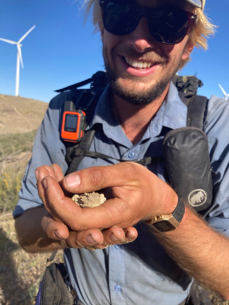 This may have been a mistake because from here, the wind is absolutely bonkers. We’re trying to go another mile to find somewhere to camp, but the minute we enter this winding valley, the wind pushes against us so hard that it almost throws us off the trail. There are more wind turbines along the ridge, which makes a lot of sense given the weather conditions. Down we go, around more ridges, occasionally tucking into a corner with less wind but inevitably entering another wall of force. I can’t remember hiking in wind like this before. It is powerful and irritating and mighty. I start to worry about finding a campsite. Where can we possibly go to get away from this? I guess we just have to keep going.