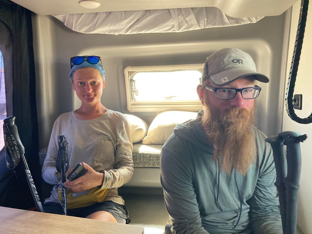 Just as I’m about to tell Sarah that we’re good to have her pick us up, we get offered a ride. It’s a guy whose wife is hiking the PCT, and he’s taking his outfitted van around to support her. We pile around the cute little table in the back and he drives us to Tehachapi. Woo hoo, town!