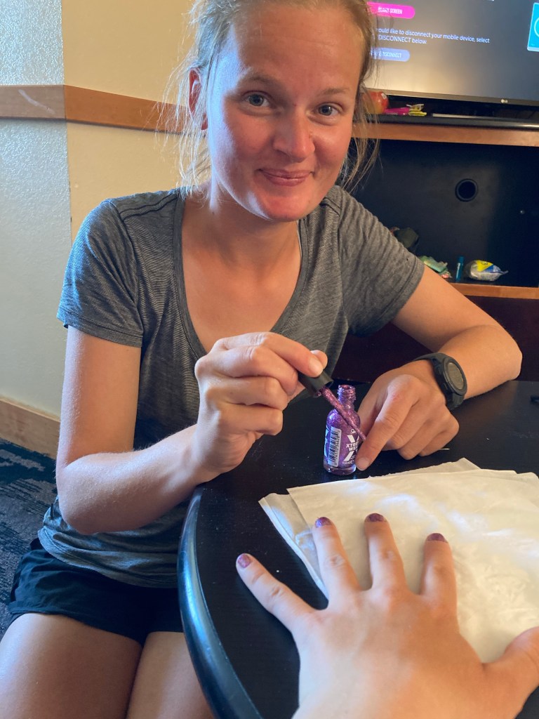 The afternoon consists of a whirlwind of tasks: repackaging and reorganizing resupply, continuing to wash off gear, downloading new audio content, making calls, and so on. I also squeeze in a nail session with some extremely sparkly polish I found in the hiker box at Rae’s. It’s a purply-pink color and I would never buy such a thing in real life, but this is the trail and it was free. Petra hops in and does my right hand, and we have some nice girl time while DLT and Catless are getting drinks a few doors down with Feather Blue. I put on some chill music, crack open a Moose Drool, and feel so relaxed.