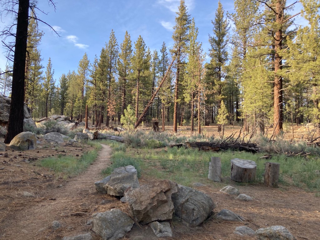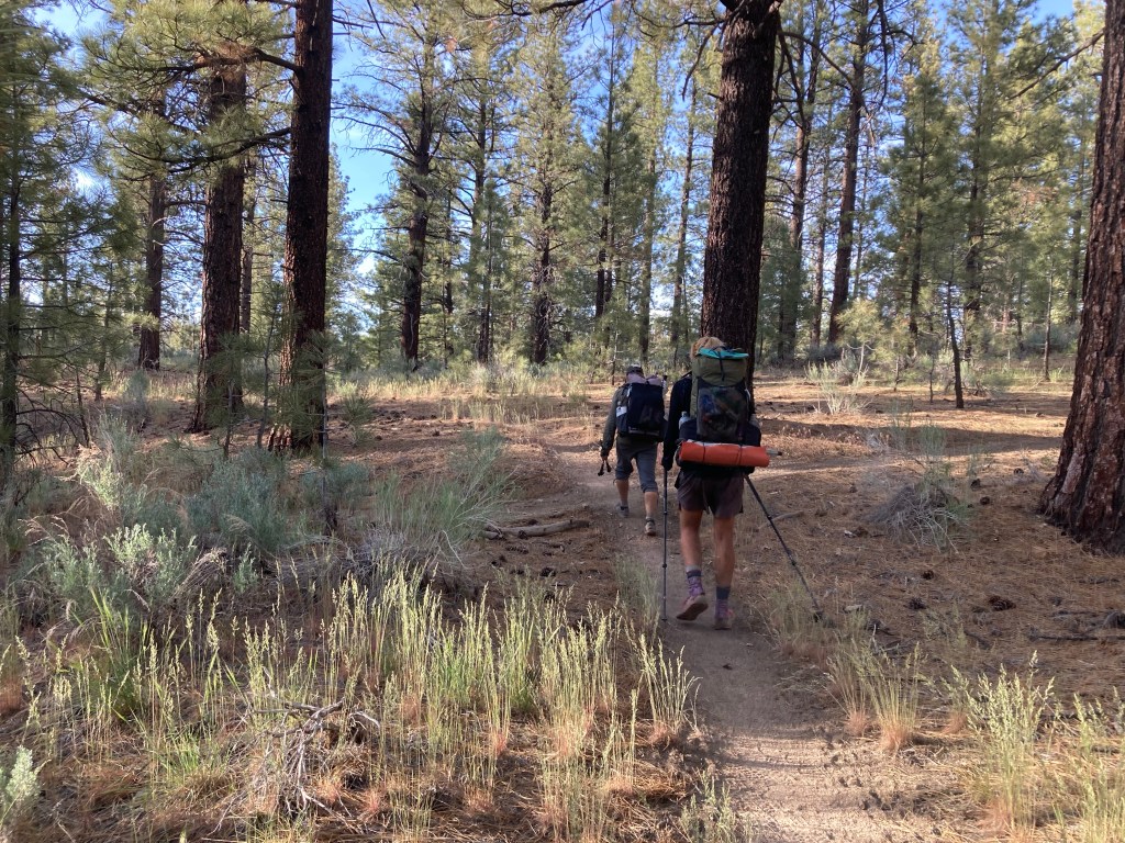 We have seven more miles to the campsite we’re shooting for. Apparently this is where Andy and Beetle are going too. DLT and I start up the hill together, and then we realize it’s going to be very slow. It’s just one of those nights. After the uphill it’s a nice ridge and then, out of nowhere, a beautiful conifer forest with needles all over the ground between boulders. We catch up to Catless and then cruise a smooth three miles. This feels like a different trail now. It feels very Sierra-ish. It smells like mountain and high elevation and I feel peaceful here in this light with my friends.