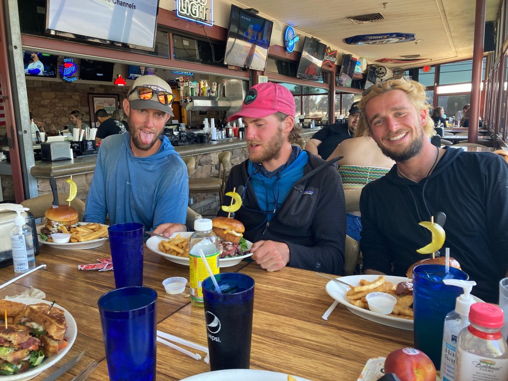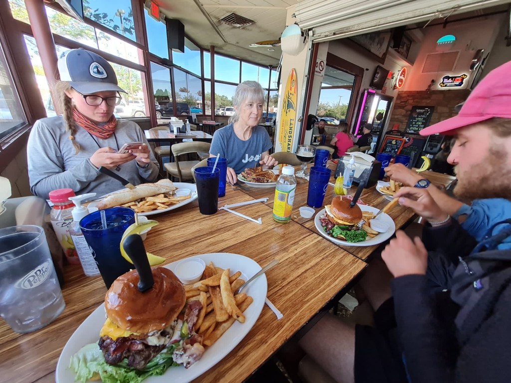 She drives us to Ridgecrest. We resupply at Albertson’s, then she takes us to a patio bar restaurant across the street for dinner. It has a huge selection and ends up being really tasty, but the music is loud and… interesting. Still, I enjoy my Philly cheese steak, and Andy, Beetle, and DLT enjoy their massive burgers stuffed with just about everything you could imagine. Oh, hiking. It’s nice to talk with Lisa while we eat. She hopes to do the JMT this year, and maybe even the whole PCT one day. I always love talking to other hikers and prospective thru-hikers about their experiences and plans.