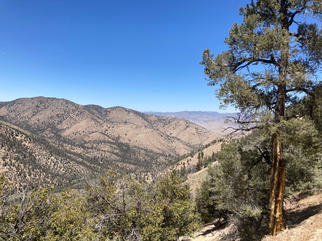 Finally, the trail levels out, then starts to head down into pleasant forests. It’s an interesting forest. There are conifers but also trees that look like juniper. I can tell we’re entering serious mountains now, but there are vestiges of desert. DLT and I keep walking together until I have to bound off trail for the inevitable morning cathole, and after that I’m walking alone for a while listening to podcasts. At the start of the trail, when I was alone, it would always be music, but I think I’m getting a little tired of that. Podcasts it is for the foreseeable future.